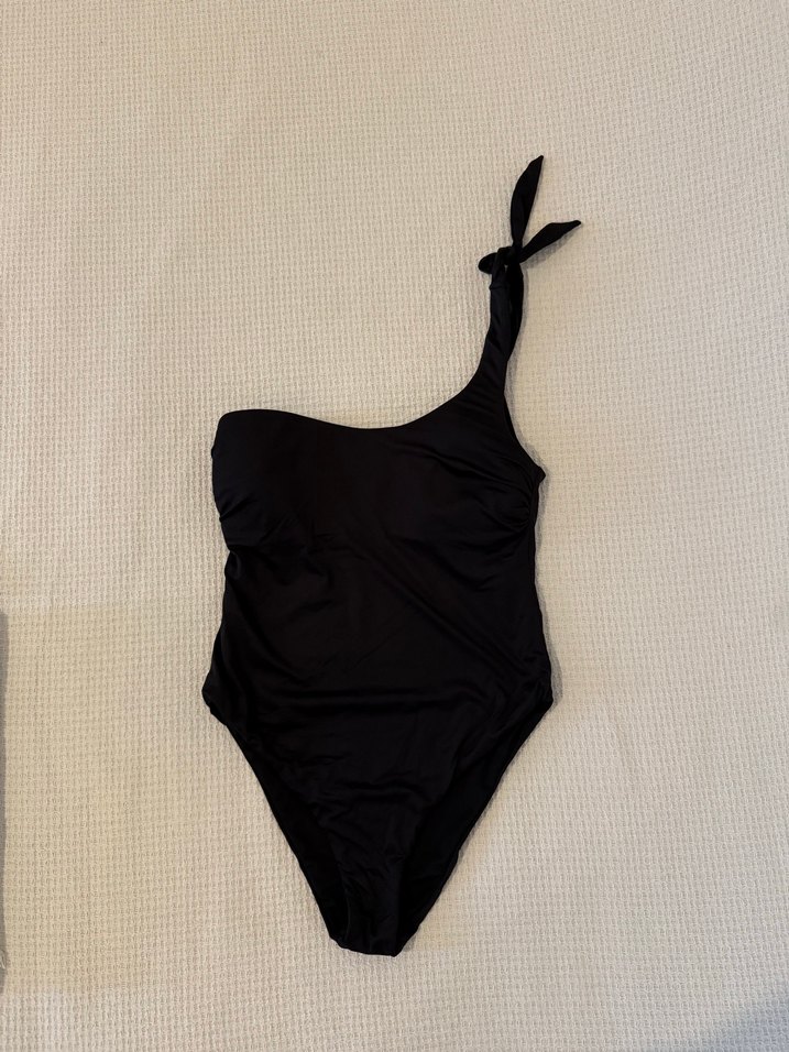 Tek omuzlu, siyah ve strappy askılı, vücuda oturan mayo. Cesur ve minimal goth tarzıyla plajda şık bir görünüm sağlar. Hiç bir defosu yoktur. 1-2 kez giyildi.