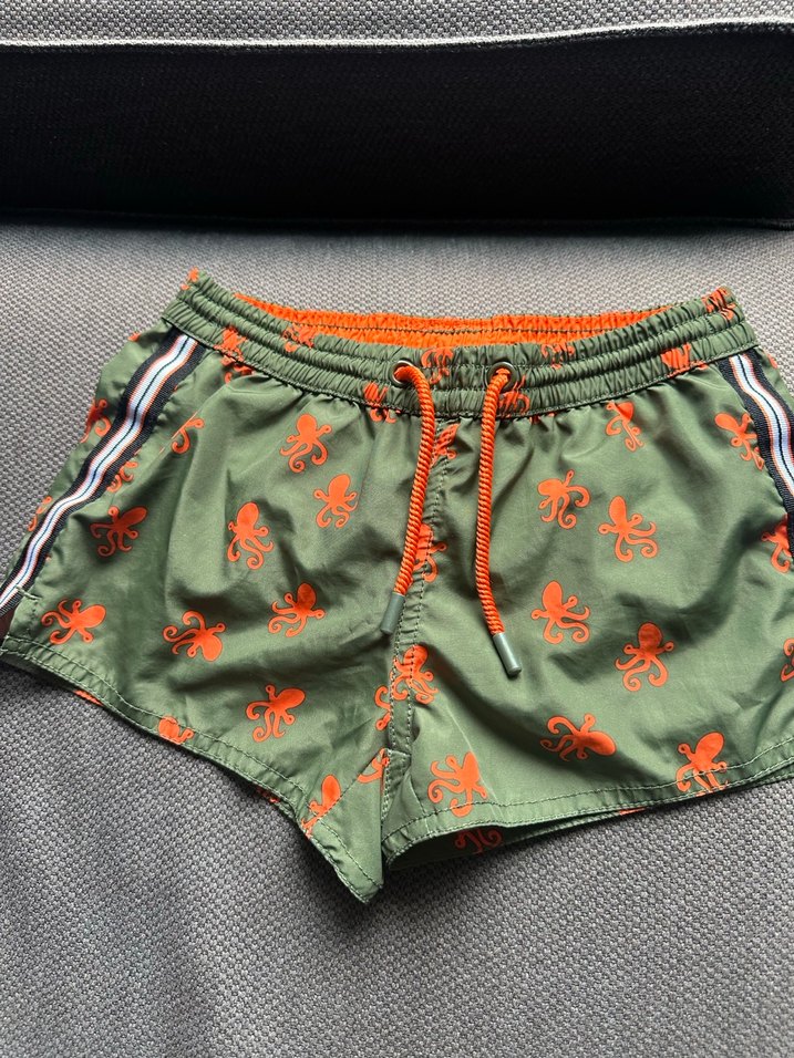 Turuncu ahtapot baskılı yeşil, belden bağlamalı, yan çizgili, calzedonia marka deniz sortu.