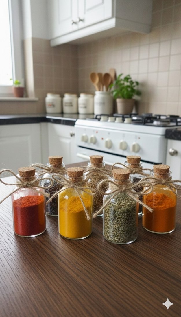 Mantar kapaklı, ip detaylı küçük cam baharat kavanozları seti. Renkli baharatlarla dolu, mutfakta düzen sağlar. el yapımı sıfır ürün.