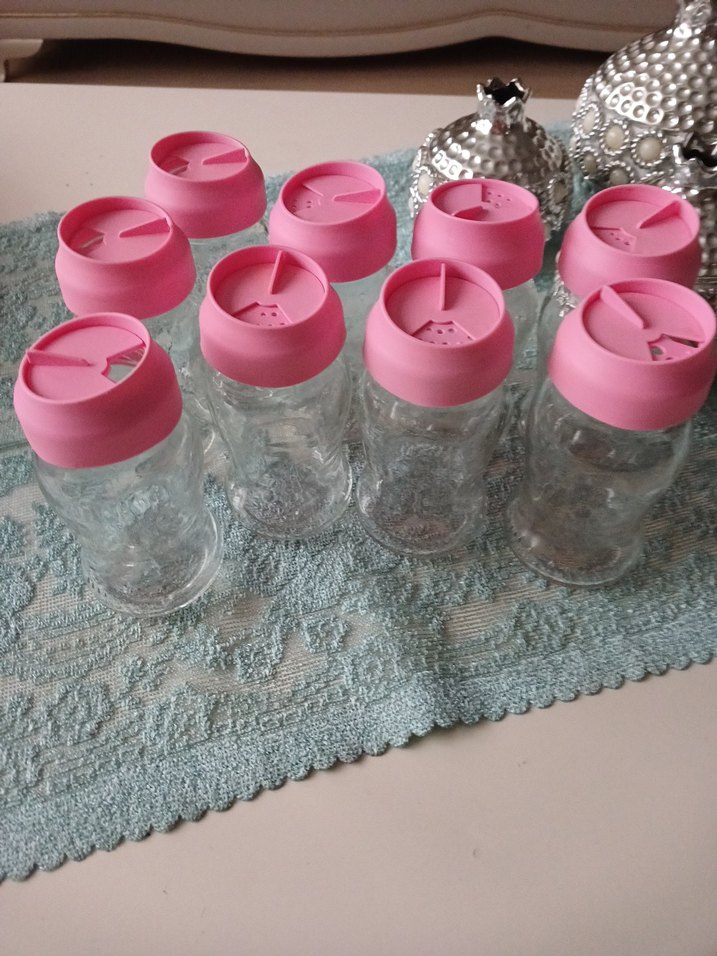 9 adet 0 ayarında cam baharatlık takımı resimde görüldüğü gibi iç haznesi de geniş