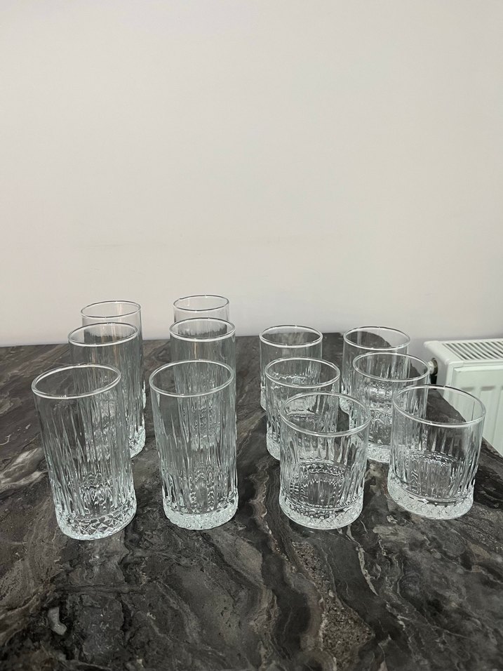 Farklı boylarda dokulu tasarıma sahip cam bardak seti, çeşitli içecekler için uygundur. Bir adet küçük bardağında üretim hatası var görselini ekledim