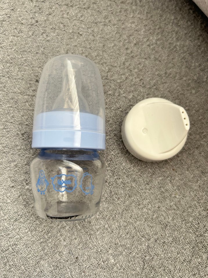 Mavi kapaklı, şeffaf gövdeli ve mavi desenli bebek biberonu. Yanında ekstra beyaz kapak bulunur.