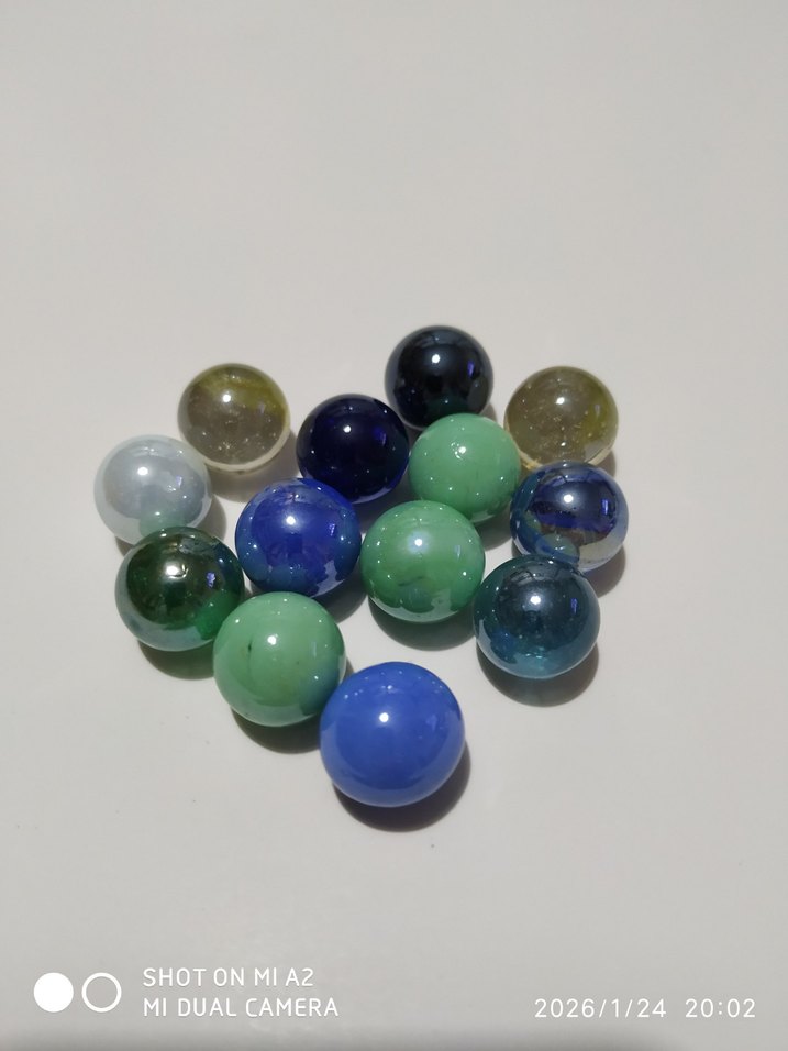 Cam bilye, 13 adet, aynı boyutlarda, farklı renklerde, eskilerden.