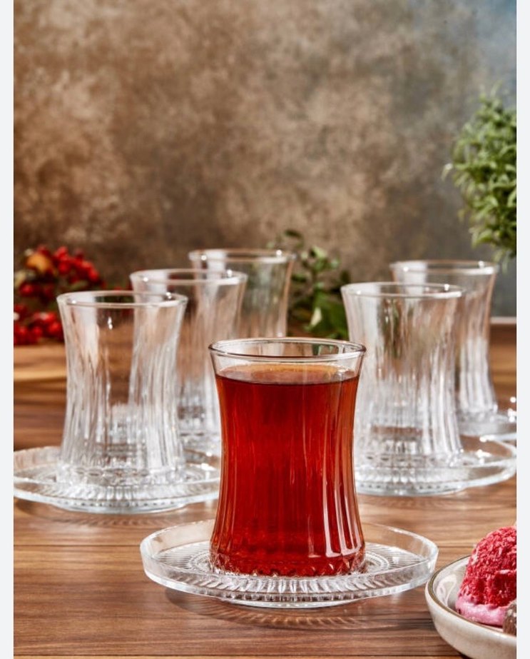 6kişilik 12 parça ince, kabartmalı cam bardaklar ve tabaklardan oluşan çay takımı. Çeyizim için alındı hiç kullanılmadı temiz ürün