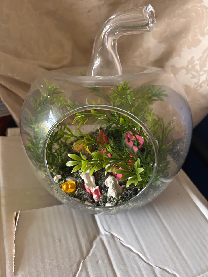 Renkli ve yeşil bitkilerle dolu cam elma teraryum, ev dekorasyonuna canlılık katar. Oldukça şık ve gösterişli bir teraryumdur bulunduğu ortama renk ve şıklık katacaktır içerisinde canlı bitki bulunmadığından bakım ihtiyacı yoktur. Ev dekorasyonu için ya da hediyelik olarak kullanılabilir.