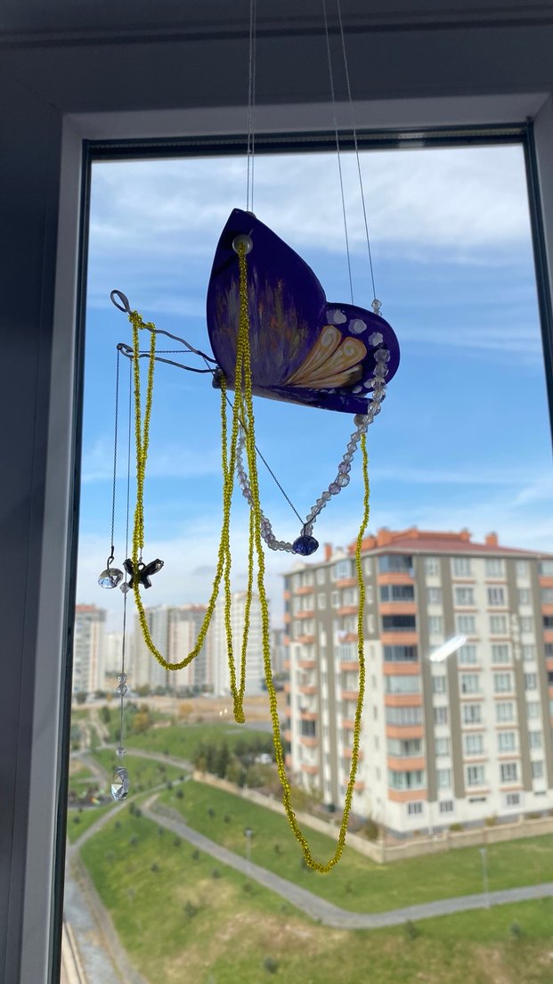 Mor rengin hakim olduğu ve avangart bir tasarıma sahip olan tamamı el yapımı boncuklar,inciler ile taçlandırılmış cam güzelim pencerelerinize neşe katmaya geldi yapması benden camlarınızı süslemesi sizlerden.