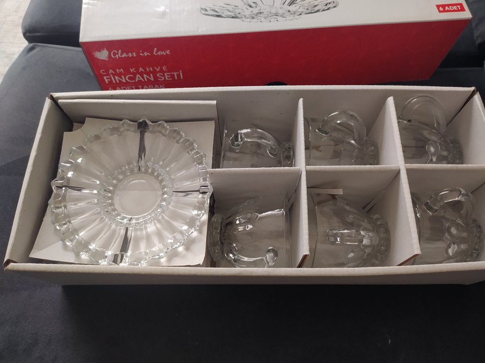 Şeffaf cam kahve fincanları ve uyumlu tabaklardan oluşan set, zarif bir tasarıma sahiptir. ☕