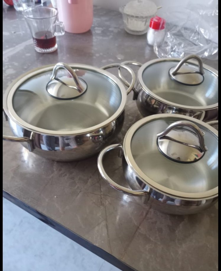 Üç adet cam kapaklı gri çelik tencere seti, sağlam kulpları ile kolay kullanım sağlar.