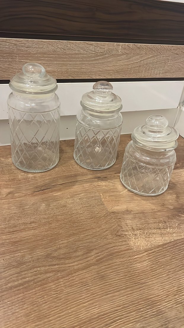 Kapaklı, elmas desenli üçlü cam mutfak kavanoz seti. Çeşitli malzemeleri saklamak için uygundur.