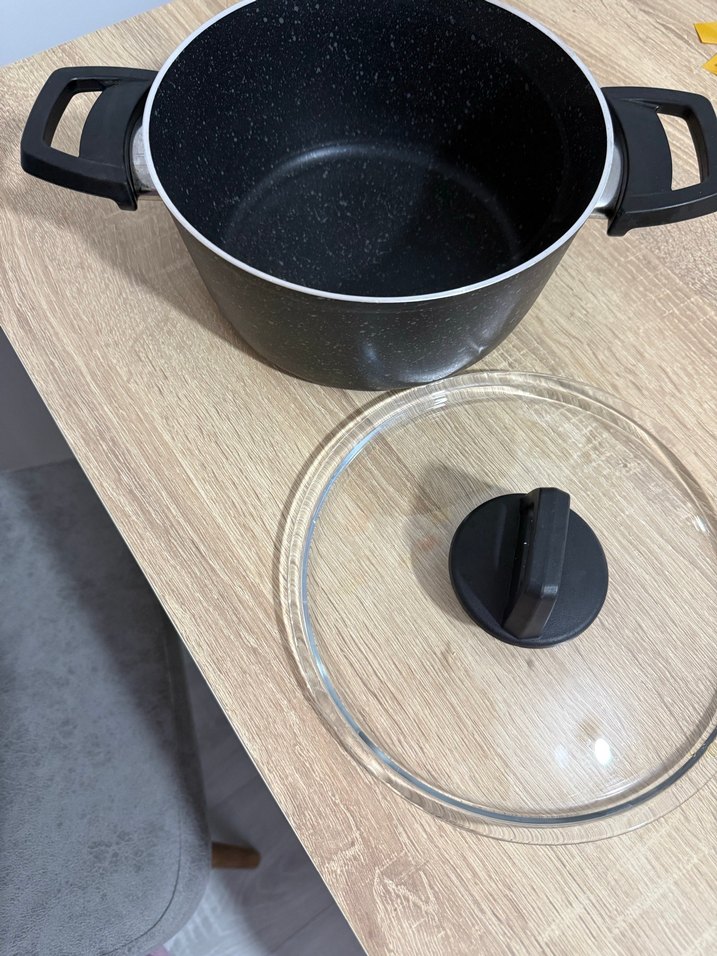 İki kulplu, siyah granit görünümlü iç yüzeye sahip tencere ve siyah kulplu cam kapak.