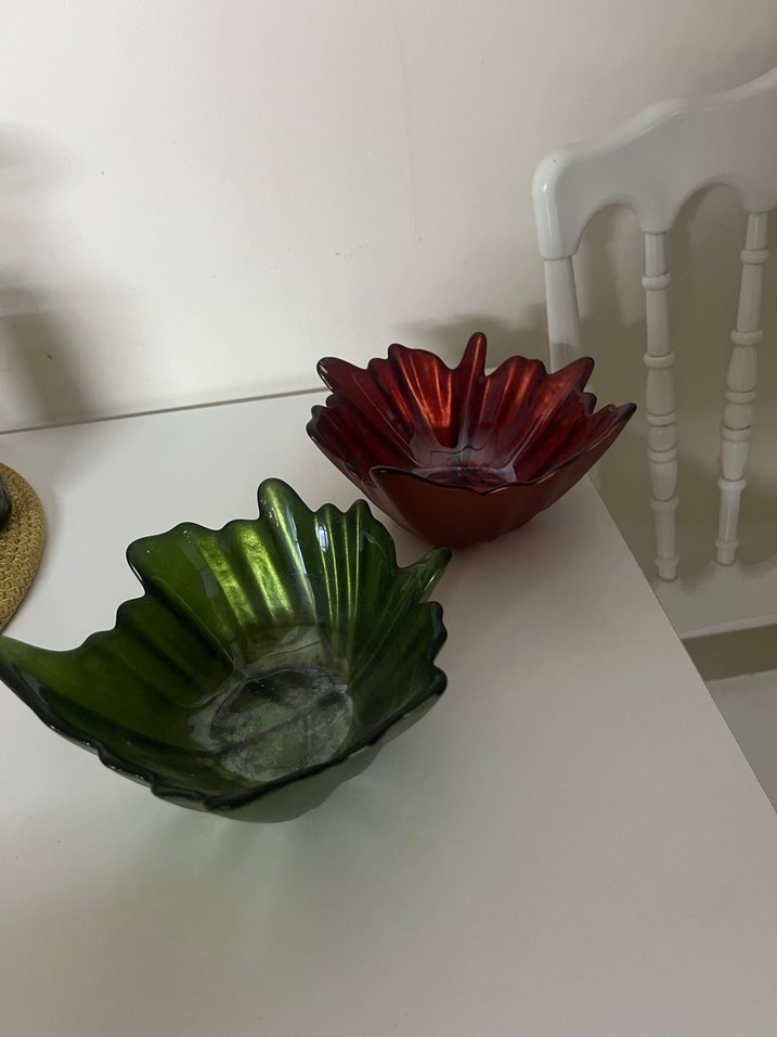 Koyu yeşil ve kırmızı renklerde, çiçek desenli vintage tarzda, yaprak şeklinde tasarlanmış dekoratif tabaklar.