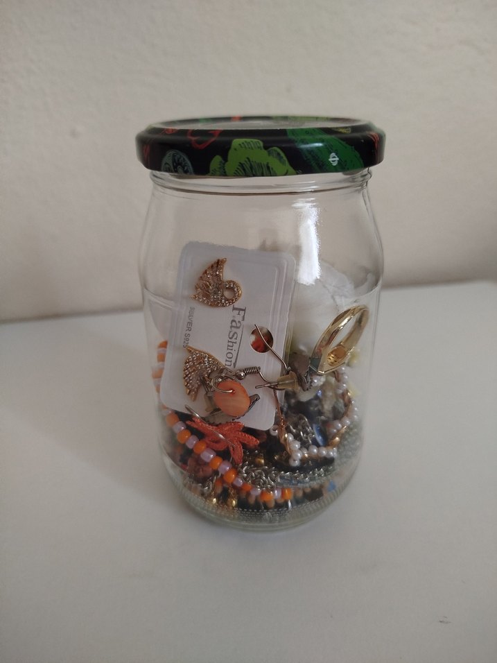 Cam kavanoz içinde çeşitli renkli boncuklu ve metal detaylı takılar yer alıyor. Küpe ve bileklik gibi parçalar bulunur.
