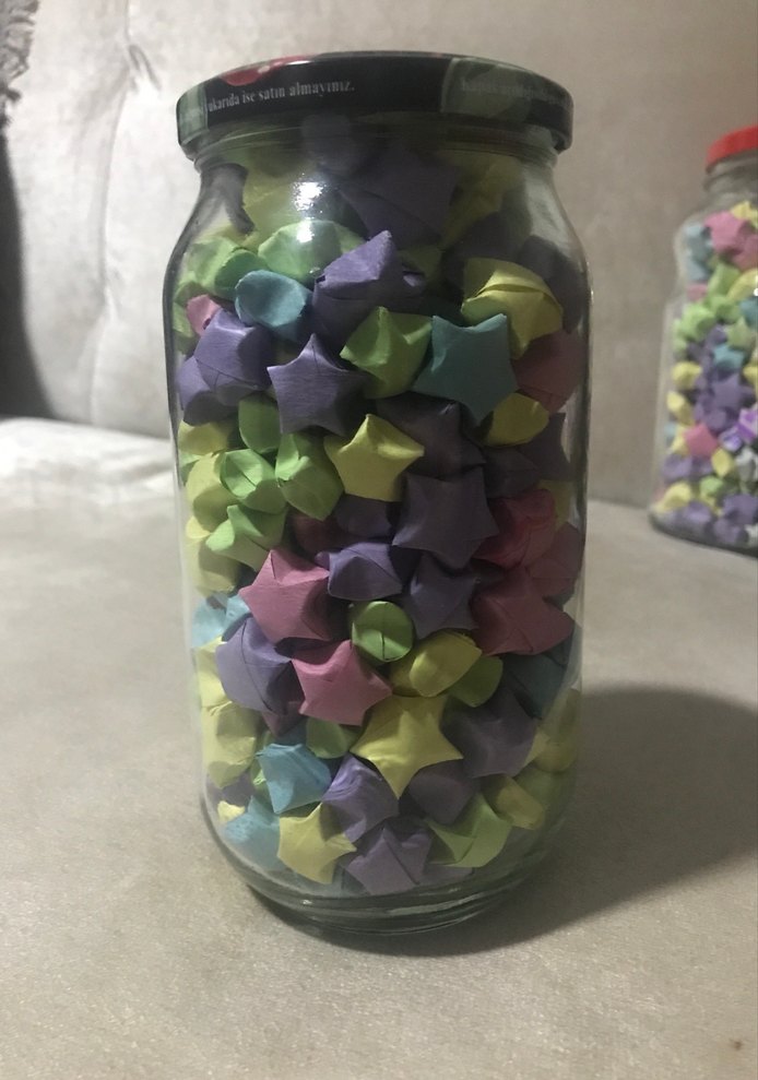 Cam kavanoz içinde pastel tonlarda yeşil, mor, sarı ve pembe origami yıldızlar bulunur. Yumuşak katlanmış kağıt dokusuna sahiptir. Süsleme olarak kullanılır 1 kiloluk konserve kavanozu