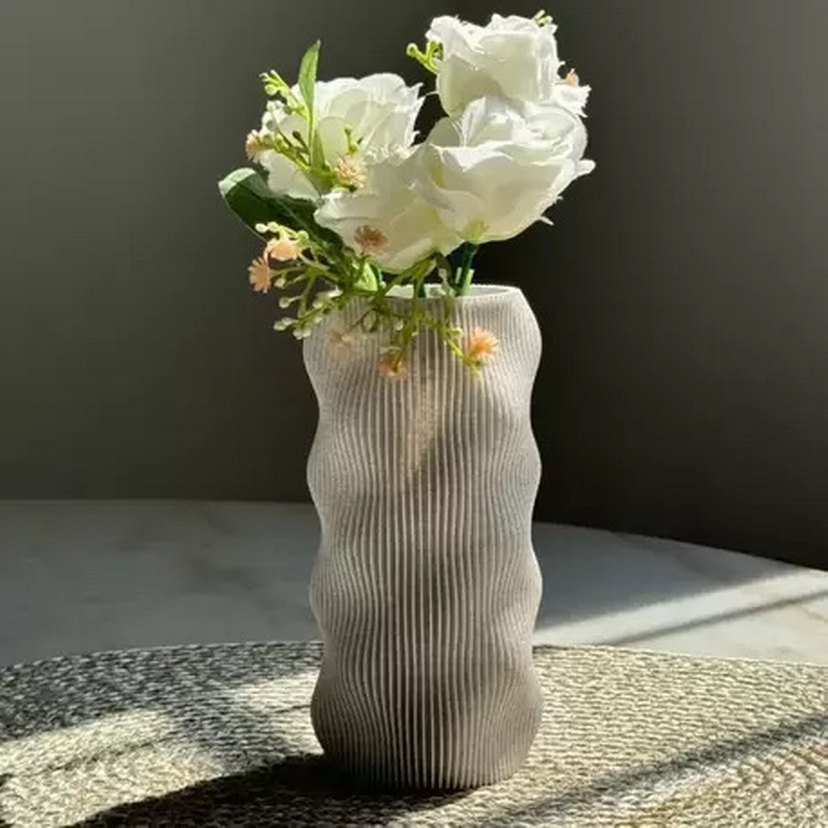 İstenilen renkte üretim yapılabilir. Çam kozalağından ilham alınarak tasarlanmış, dokulu yüzeye sahip dekoratif vazodur. Doğal formu andıran deseni sayesinde modern ve minimal dekorasyonlara güçlü bir görsel katkı sağlar. Siyah ve beyaz renk kombinasyonu ile sade ama dikkat çekici bir duruş sunar. Masa, raf, konsol ve sehpa üzerinde tek başına dekor olarak kullanılabileceği gibi kuru çiçek ve yapay bitkilerle birlikte de tercih edilebilir. Öne Çıkan Özellikler: 3D yazıcı ile üretilmiştir Çam kozalağı desenli yüzey tasarımı Siyah & beyaz renk kombinasyonu Modern ve dekoratif form İç mekân dekoru için uygundur Teknik Bilgiler: Malzeme: PLA Yükseklik: 17 cm Renk: Siyah & beyaz Kullanım: Dekoratif vazo Dalgalı dokulu beyaz seramik vazo, çiçekler için uygundur. Hafif gri tonuyla modern bir görünüm sunar.