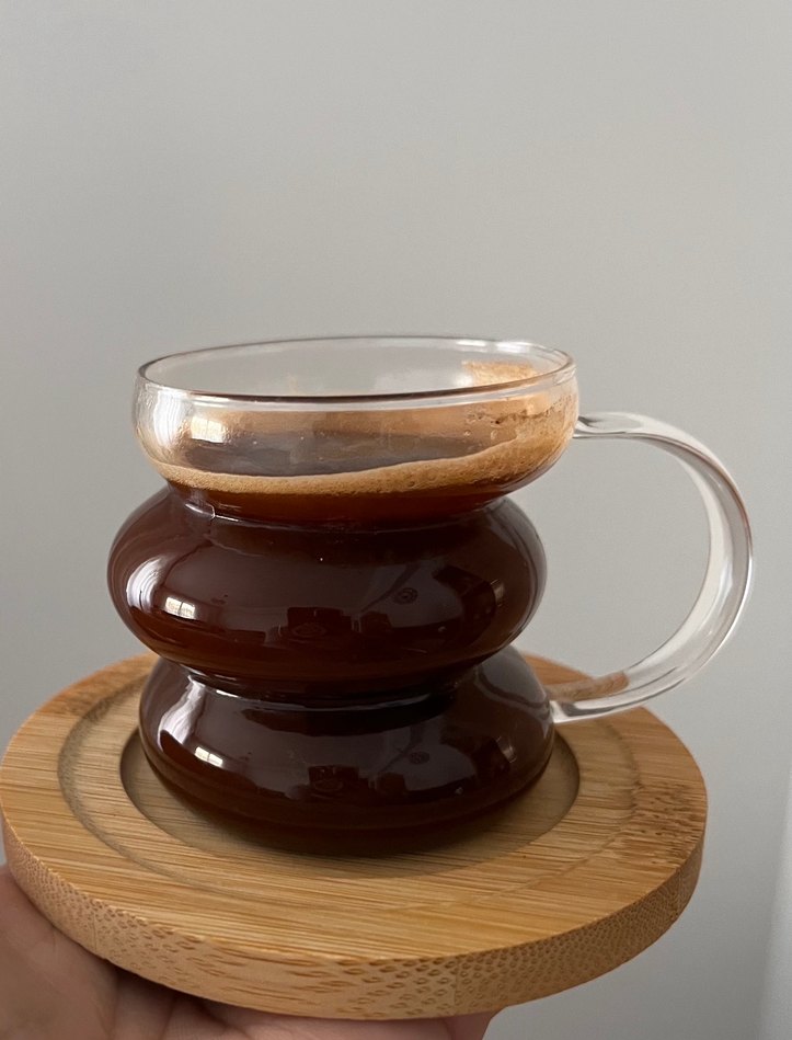 İnce camdan, yuvarlak tasarımlı kulplu bardak. Ahşap altlık ekstra ücrete tabiidir. Altılı fincan takımı kahve için uygundur. ☕ #fincan #fincantakımı #camfincan #altılıfincan