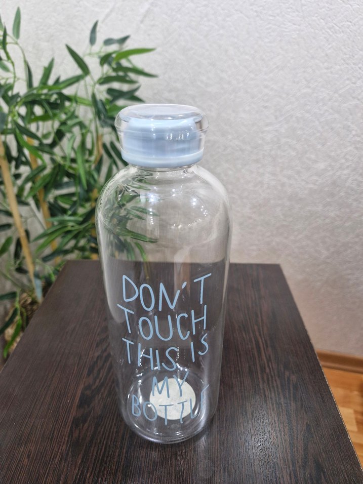 Beyaz kapaklı, üzerinde 'DON'T TOUCH THIS IS MY BOTTLE' yazan şeffaf cam matara.