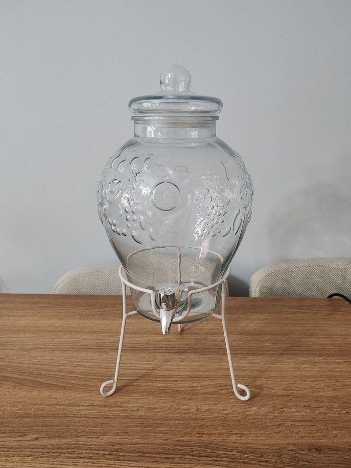 Beyaz metal ayaklı, kapaklı ve musluklu, kabartmalı desenli şeffaf cam sebil. Marka temsili