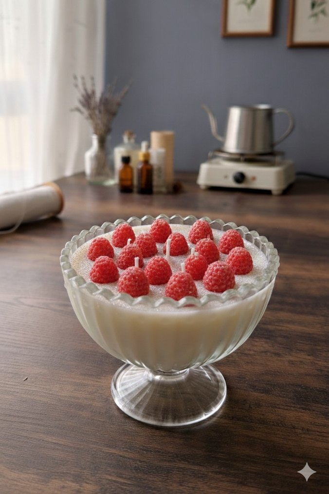 Beyaz, tatlı şeklinde dekoratif mum, üzerinde kırmızı meyve detayları bulunur. Şeffaf camlı, dalgalı kenarlı bir tutucuda yer alır. ️