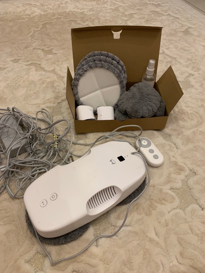 Uzaktan kumandalı beyaz ve gri elektrikli temizlik robotu, çeşitli temizlik aksesuarlarıyla birlikte. Cam, ayna temizliği için uygundur.