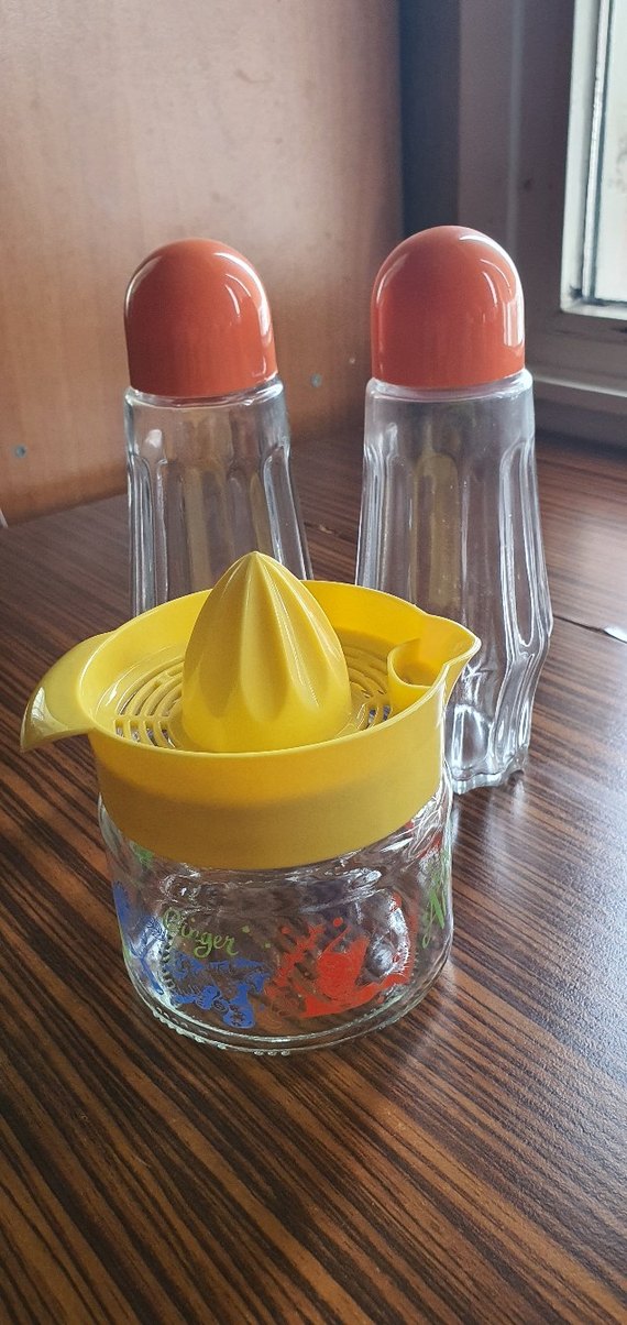 Sarı sıkacaklı cam kap ve turuncu kapaklı iki cam baharatlık içeren renkli mutfak seti.