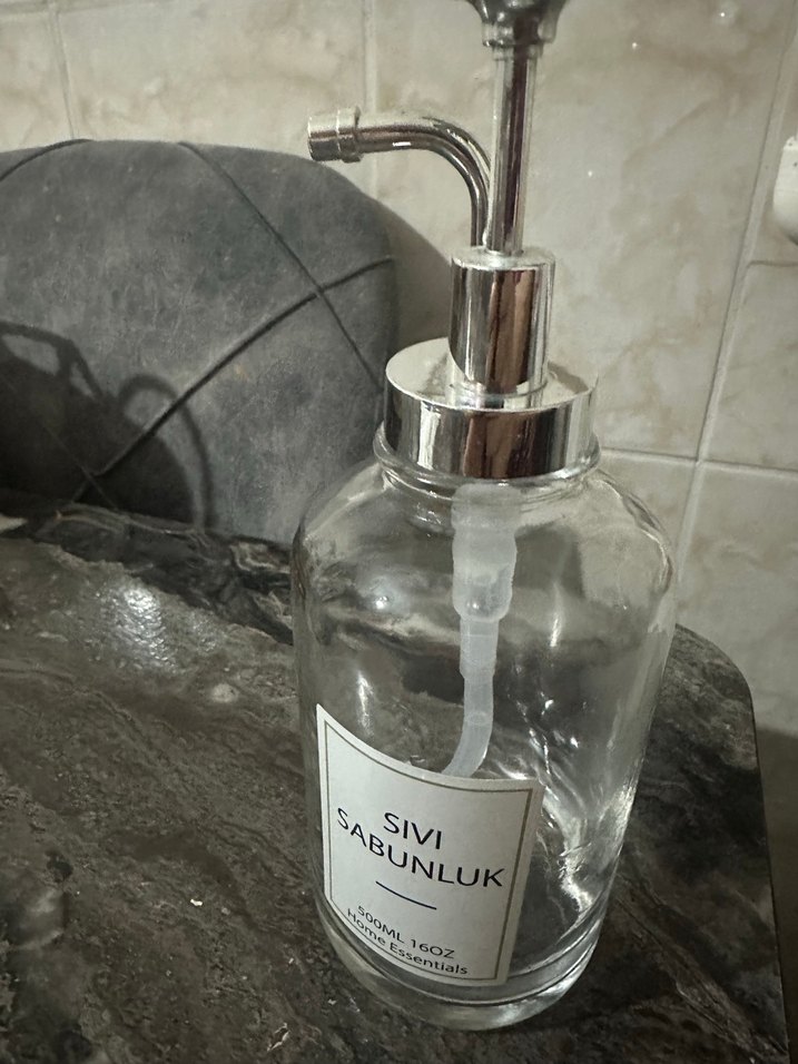 Metal pompalı, 450ml kapasiteli şeffaf cam sıvı sabunluk. Banyo kullanımına uygundur.