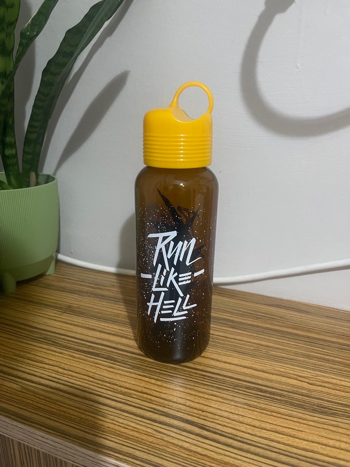 Sarı kapaklı ve renkli tasarımlı , Run Like Hell" yazılıdır. Kullanışlı halka kulpu vardır. Sıfır hiç kullanılmadı orjinal defactodan alındı #suluk #matara #camşişe #şişe #defacto