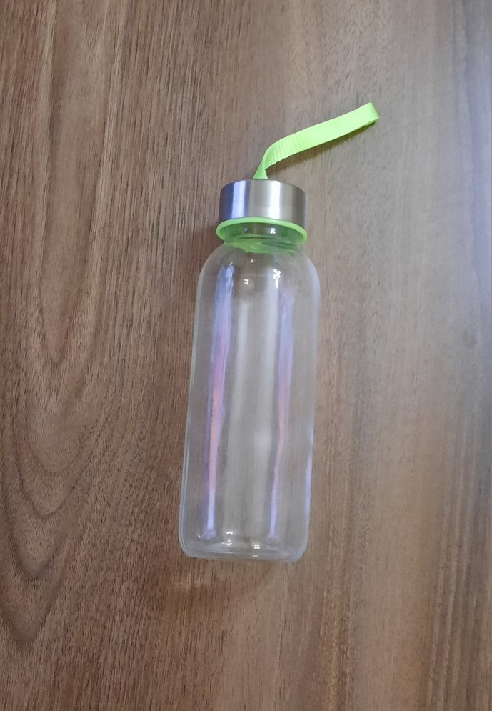 Şeffaf gövdeli, gümüş kapaklı ve taşıma için yeşil askısı olan pastel yeşil suluk