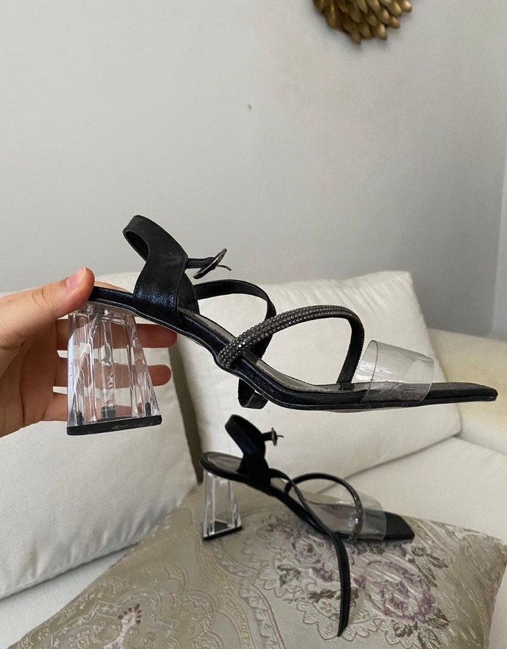 Cam topuklu, siyah yılan desenli gece ayakkabısı. Tokalı detaylarla parti için göz alıcı bir seçim.