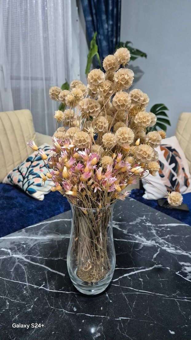 Pastel tonlarda kuru çiçeklerle dolu cam vazo, dekorasyona doğal ve sade bir dokunuş katıyor.