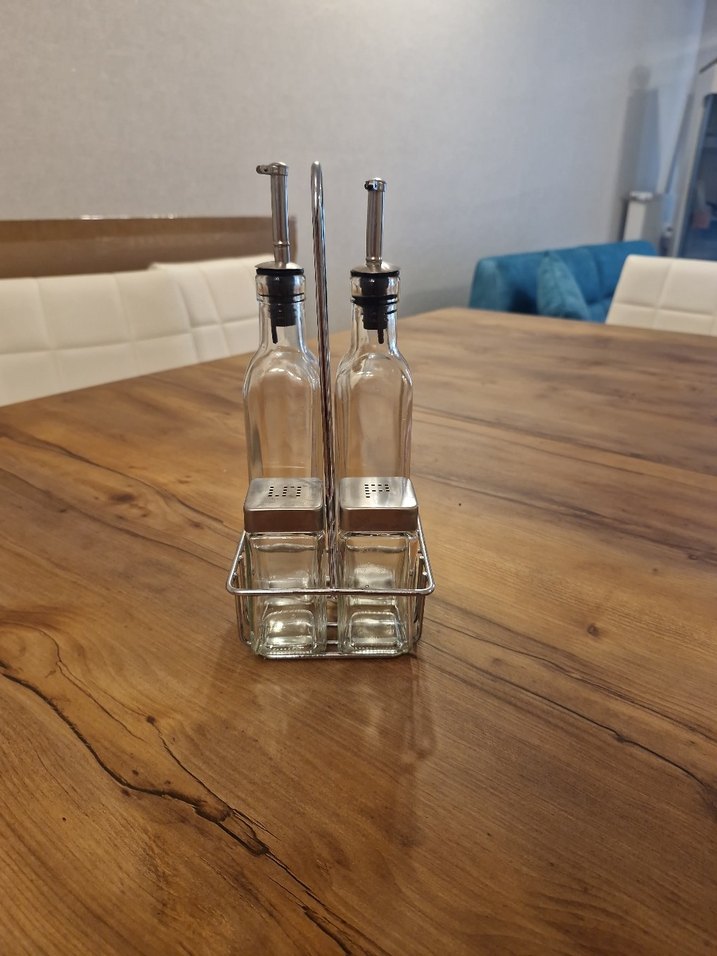 İki adet cam şişe, metal damlatma ağızlığı ve gri metal stand ile yağ ve sirke için uygun set.