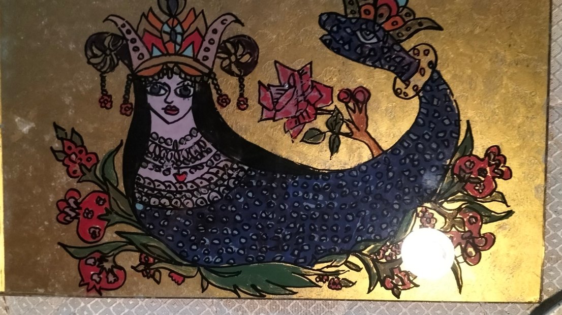 Karanlık tonlarda, altın rengi arka planlı, stilize figür ve çiçek desenleri içeren tablo. 3 adet fiyatı