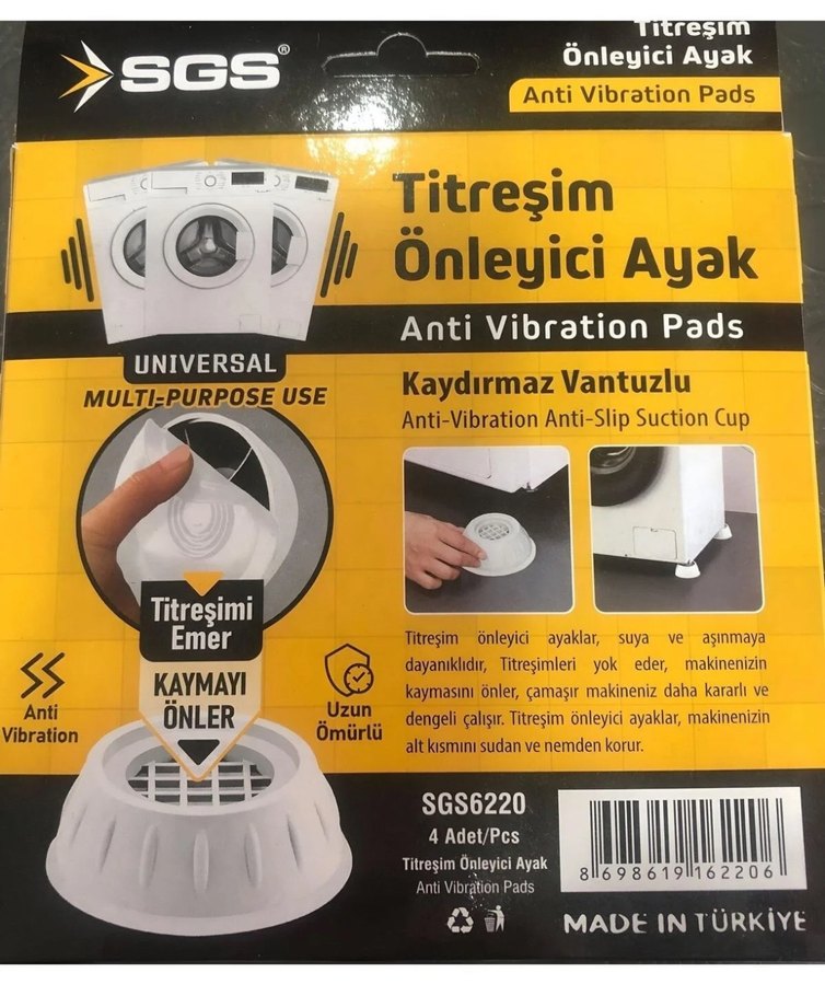 SGS titreşim önleyici ayaklar, vantuzlu tasarımı ile kaymayı önler ve titreşimleri azaltır. Suya dayanıklı ve uzun ömürlüdür, makineleri ve zemini korur. 4 adet set. SIFIR ÜRÜNDÜR elimde 3 paket mevcut 1 paket fiyatıdır