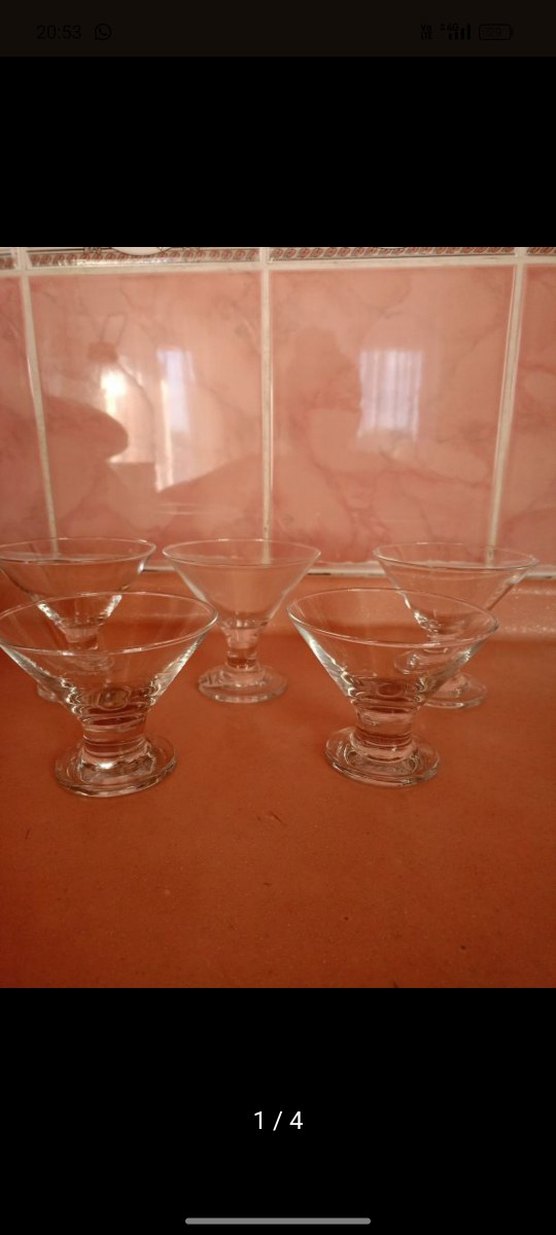 Altı adet kısa ayaklı, geniş ağızlı şeffaf cam bardak seti, tatlı için uygundur.