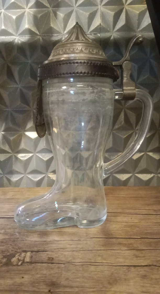 Alman Bira Bardağı.Camdan yapılmış çizme şeklinde antika bardak, bej ve gri metal kapak ve sap ile vintage bir tasarıma sahip.
