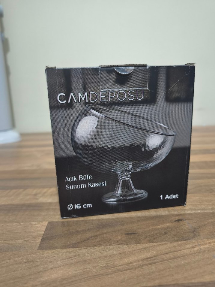 Camdeposu markasına ait 16 cm çapında cam sunum kasesi, ayaklı tasarımıyla açık büfelerde kullanıma uygundur. sıfır ürün kullanılmadı.