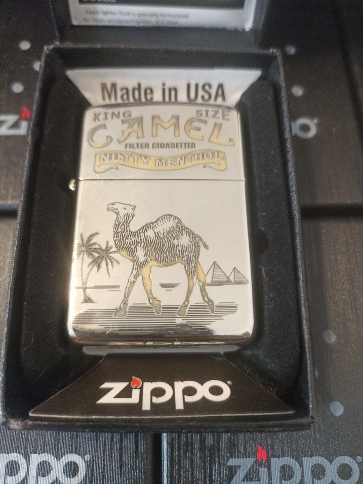 Parlak camel renginde, deve figürlü ve 'Made in USA' yazılı vintage erkek rozeti. Zippo marka.