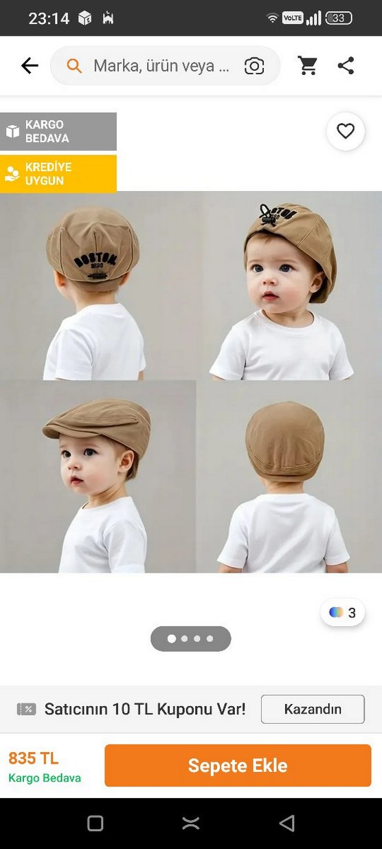 Hafif bej renkli, pamuklu erkek çocuk şapkası. Yumuşak kumaşı rahatlık sağlar ve baskılı detaylar şıklık katar. Üzerinde 'UYGUN KREDIYE' yazısı bulunur.