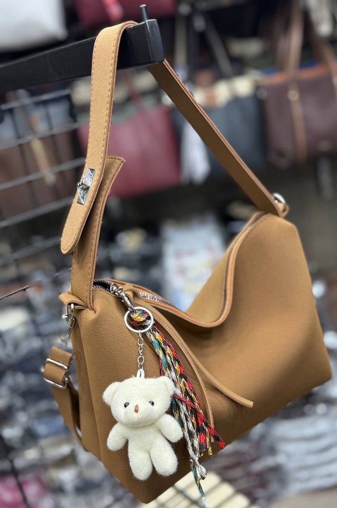Camel renkli deri kadın çanta, püskül ve küçük ayıcık aksesuarıyla dikkat çekiyor. Leopar desen detayları ve Paris sokak modası tarzıyla günlük kullanıma uygun.