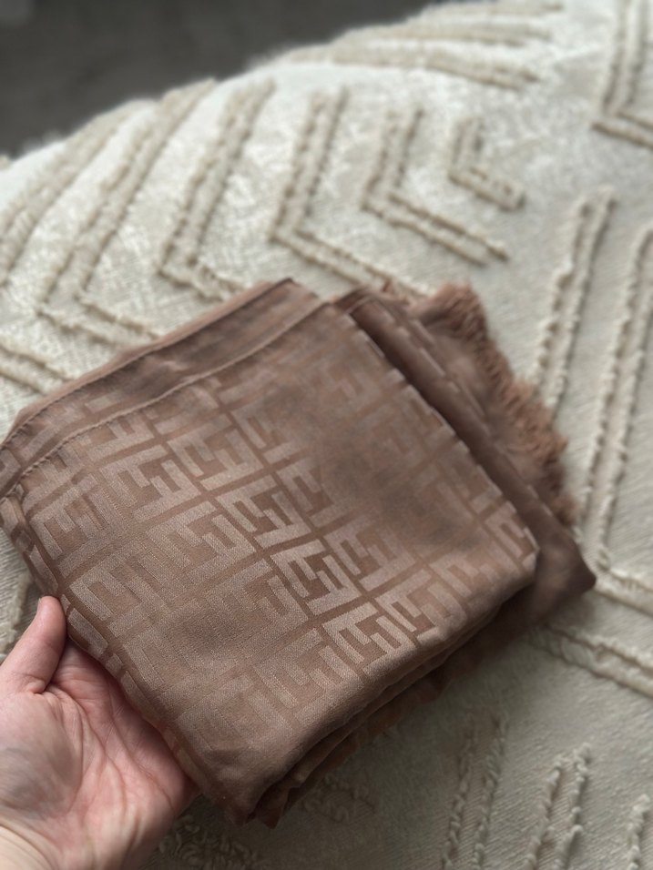 Bej keten kumaştan, hafif desenli ve drapeli bohem tarzı kadın şal. Rahat ve şık bir görünüm sağlar.