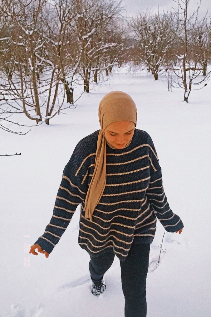 Kadınlar için bol kesim, normal boyda triko kazak. Yumuşak yünden örülmüş, açık camel rengindedir, günlük kullanıma uygundur. Kalçayı kapatır.