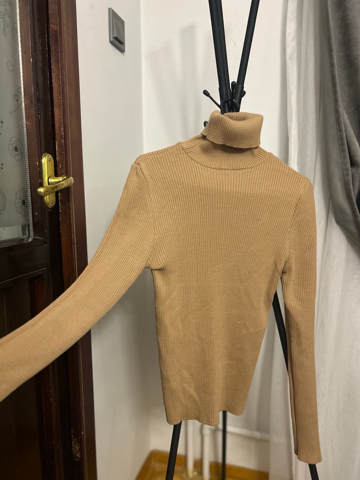 Bej-camel veya taba renk emin değilim, boğazlı ve uzun kollu kadın triko kazak. Yumuşak örgüden yapılmış, rahat ve hafif bir his sunar. Günlük sokak stiline uygundur. Esnek. Hiç giyilmedi