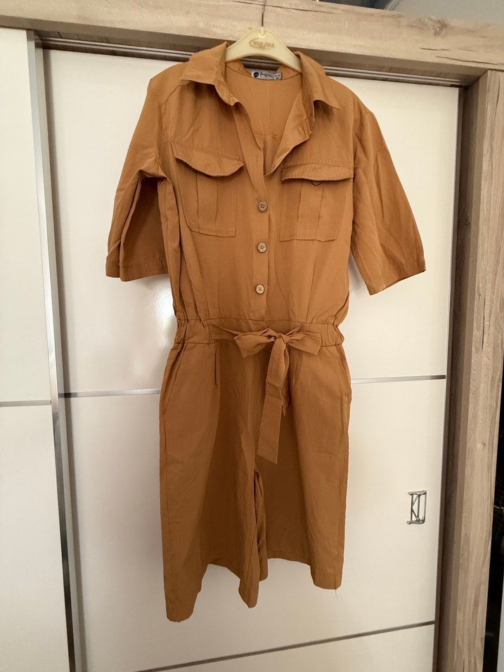 Camel renkli keten mini tulum, kısa kollu ve yakasında kesik detay bulunur. Kemerli ve bol kesimdir, şık ve rahat bir tarz sunar. ✨