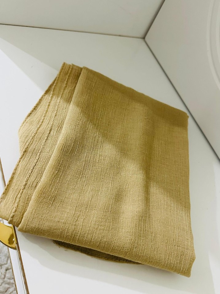 Camel keten kumaştan, parlak dokulu, sade ve bohem tarzda kadın şalı.