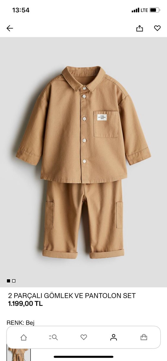 Camel renkte, düğmeli uzun kollu gömlek ve pantolondan oluşan pamuklu bebek takımı. Rahat ve sade bir tarz sunar.