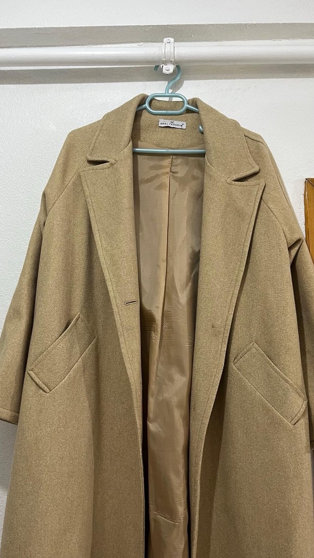 Camel rengi oversize kaban, yumuşak dokulu ve astarlı. Geniş yaka ve iki cep detayına sahip. Boyu 110 cm