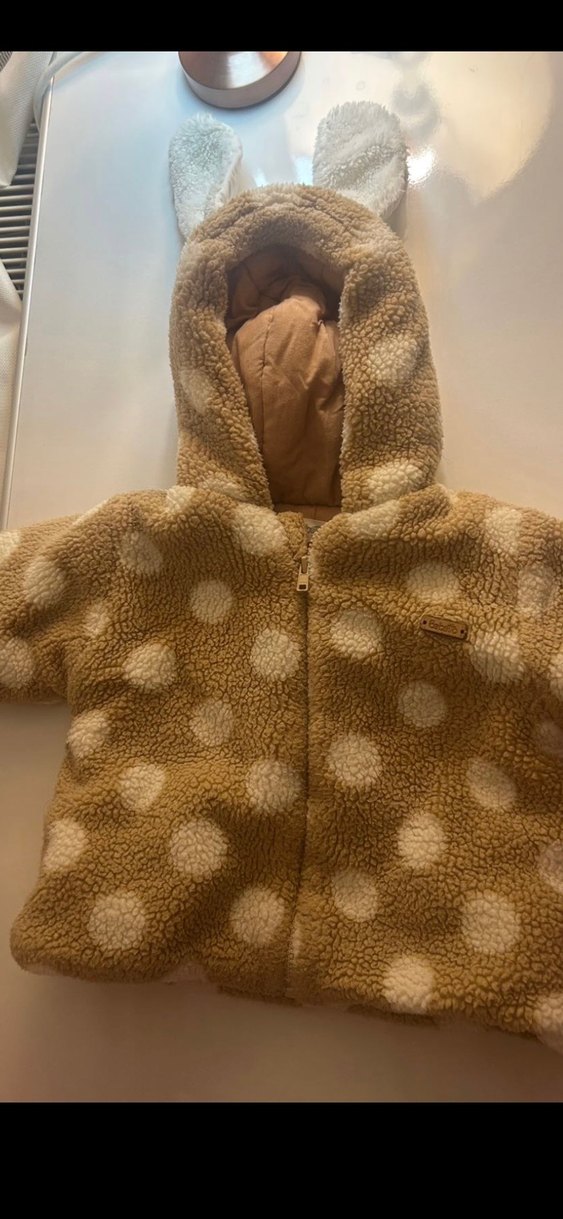 Yumuşak ve sıcak kumaştan yapılmış, kürk detaylı kapüşonlu camel rengi puantiye desenli bebek montu. Önü fermuarlıdır.