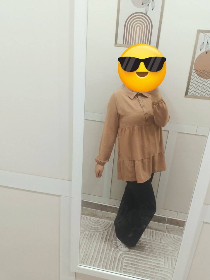 Camel renginde, yüksek yakalı ve uzun kollu salaş kesim midi tunik. Parlak dokusuyla rahat ve şık bir günlük kombin seçeneği. deforme yok