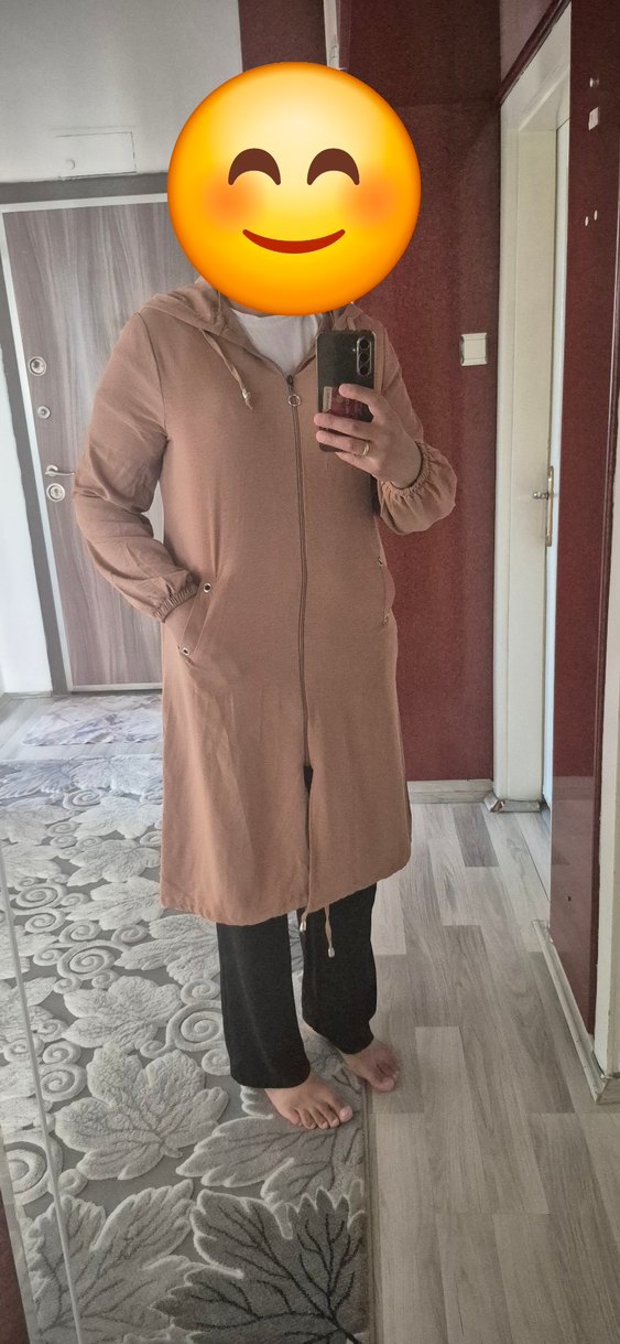 camel renk midi uzunlukta, rahat kesim Uzun kollu,yumuşak ayrobin kumaştan üretilmiştir. Günlük kullanıma uygun, desensiz, modest tarzda bir parçadır.uzunluk 106 cm Göğüs 55 cm