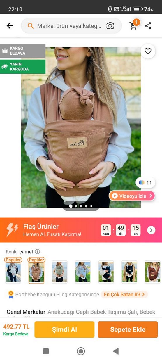 Açık camel renkte, yumuşak kumaştan yapılmış bebek kanguru sling. Bebeğinizi güvenle taşımanızı sağlar, ellerinizi serbest bırakır. bir kaç kez kullandım yeni iyi durumda almak isterseniz ürün fotoğrafını atabilirim trendyoldan aldım