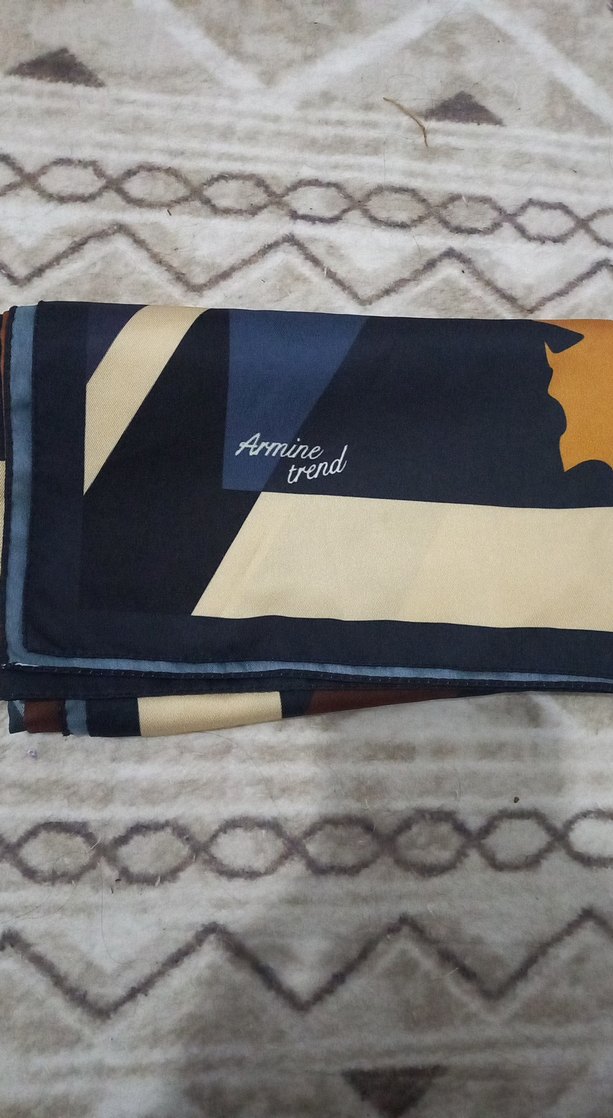 Koyu camel renkli, sentetik kumaştan drapeli kadın fular. Paris sokak modasını yansıtan, üzerinde 'Armine trend' yazısı bulunur.